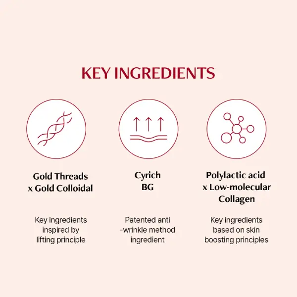 - حاوی: طلای 24 عیار، پپتید کمپلکس، کلاژن دریایی، هیالورونیک اسید، نیاسینامید، آدنوزین، عصاره گل کاملیا